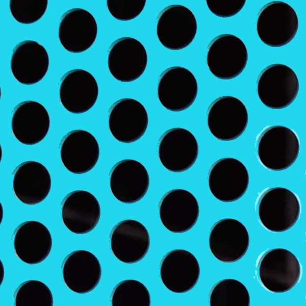 Geometric round pattern. General purpose perforated metal sheet with 9.5mm holes in a staggered pattern. It has a variety of functional uses: Seive, vertical screening, grill, infill panels and is also a great decorative screen.