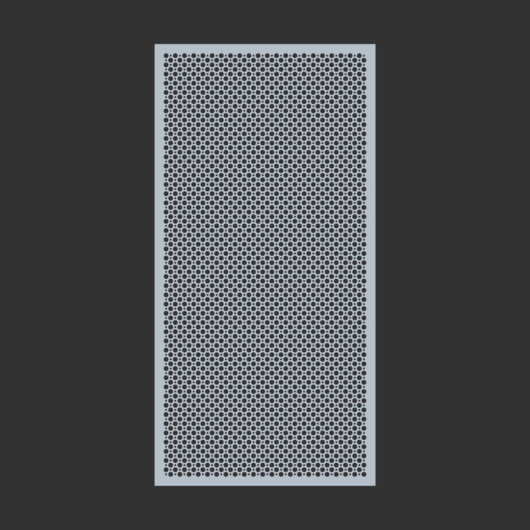 Geometric round pattern. General purpose perforated metal sheet with 2 sizes of holes to create an attractive round pattern. It has a variety of functional uses: Seive, vertical screening, grill, infill panels and is also a great decorative screen.